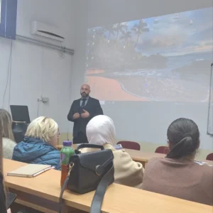 Predavanje je održao dr sci Mitar Radonjić, dugogodišnji direktor Skloništa za žrtve trgovine ljudima u Crnoj Gori, član brojnih radnih tijela u oblasti borbe protiv trgovine ljudima i međunarodno priznati ekspert sa višegodišnjim iskustvom u operativnom i strateškom suzbijanju ovog oblika organizovanog kriminala.